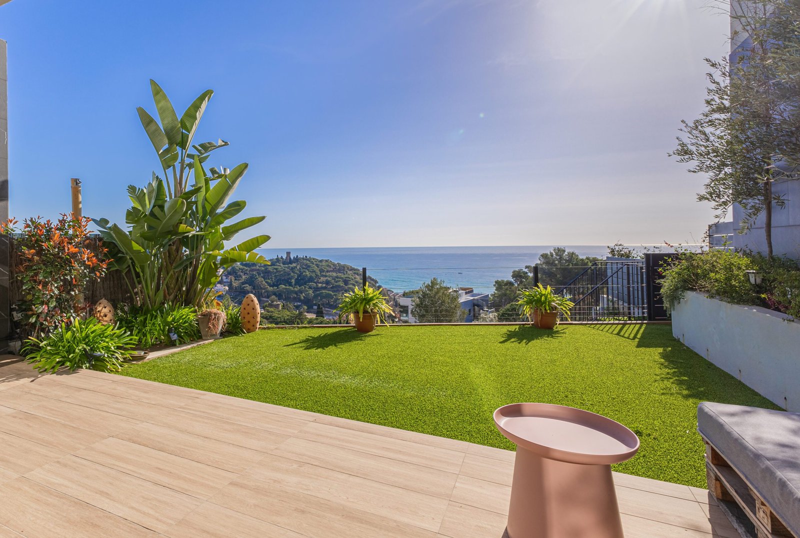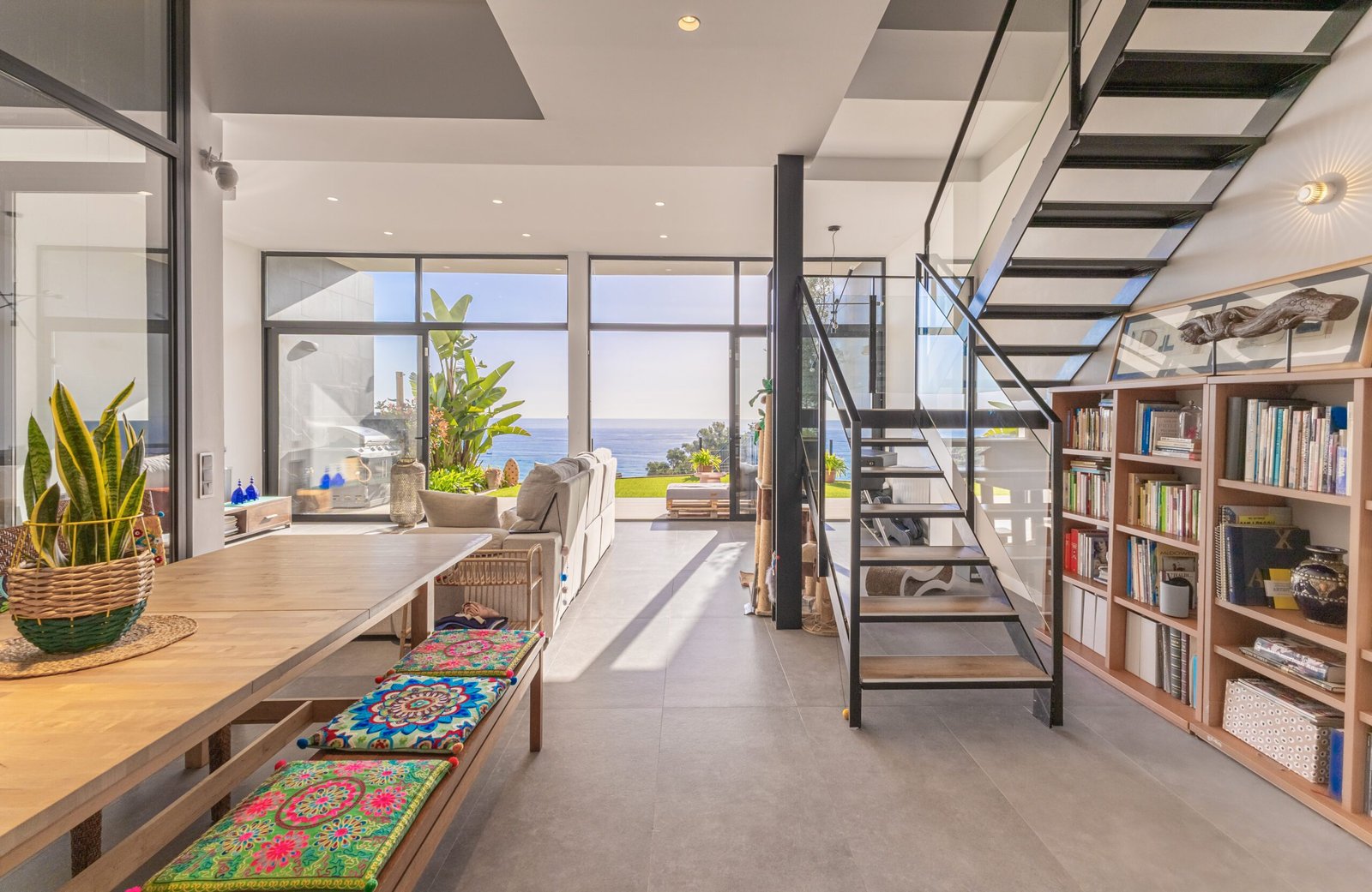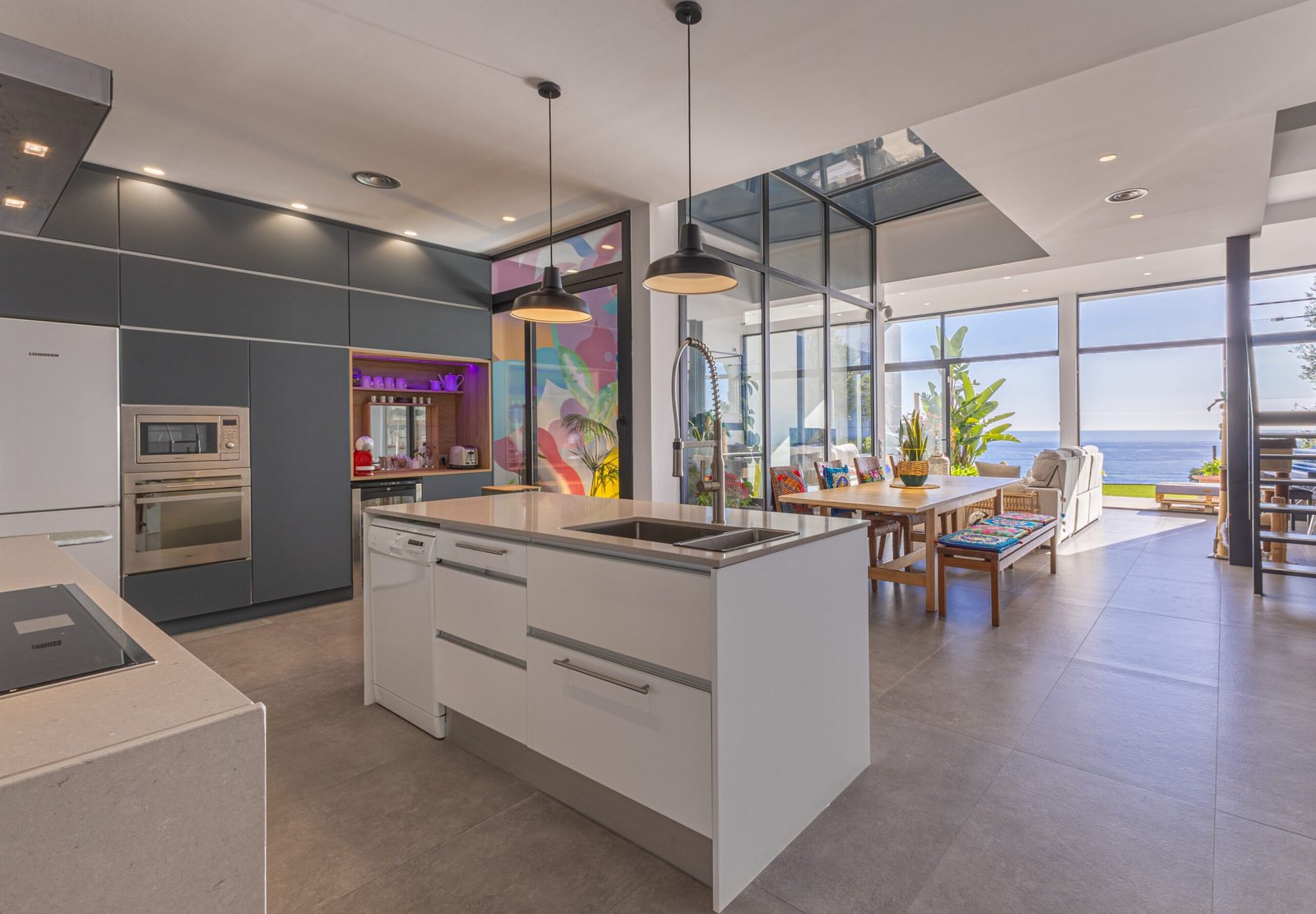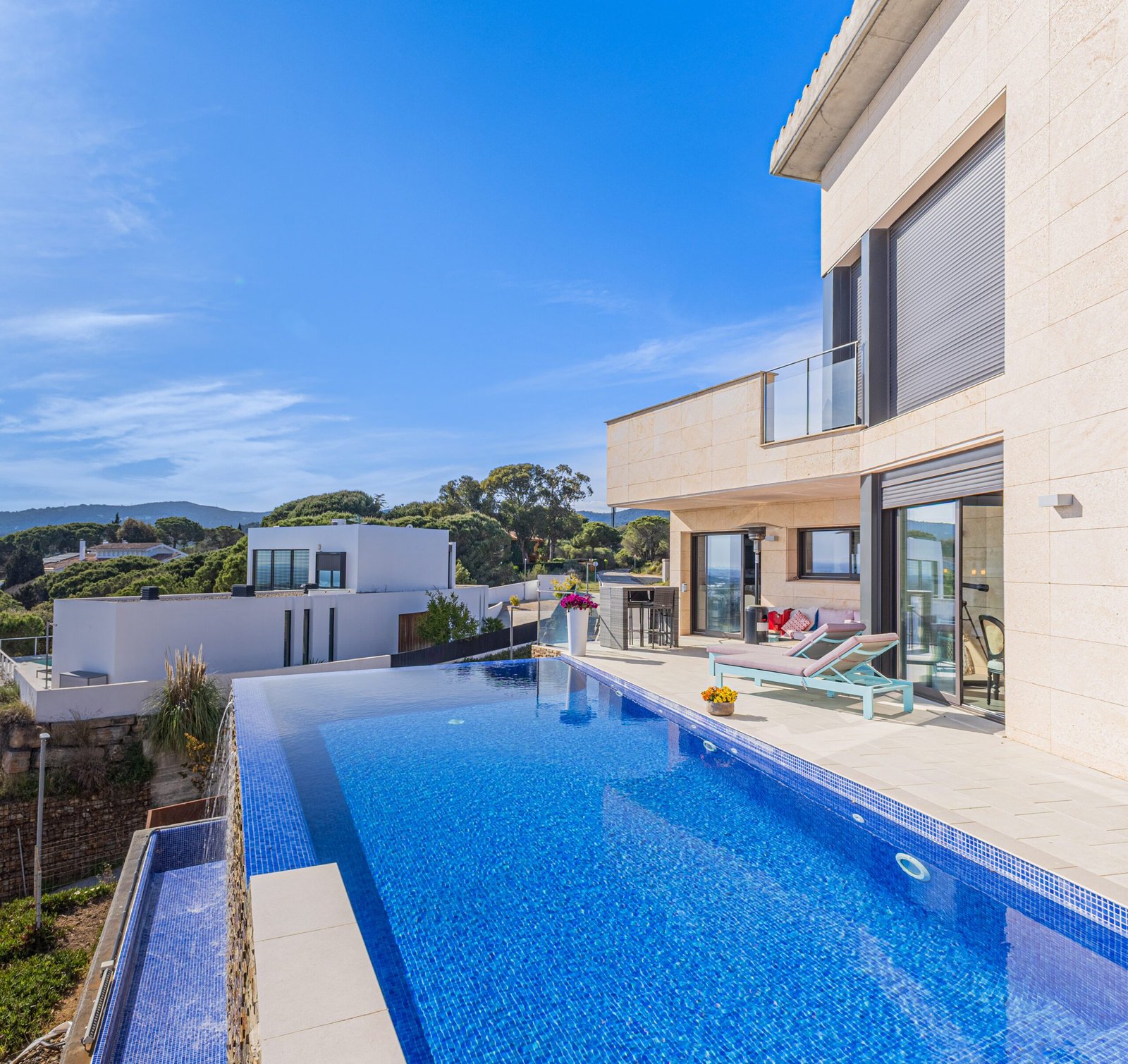 La zona d’estar s’obre directament al jardí i al mar, creant una continuïtat visual que reforça la sensació d’espai i llum. La piscina infinita i les vistes panoràmiques són protagonistes a l’exterior, aportant un caràcter exclusiu i mediterrani al conjunt.